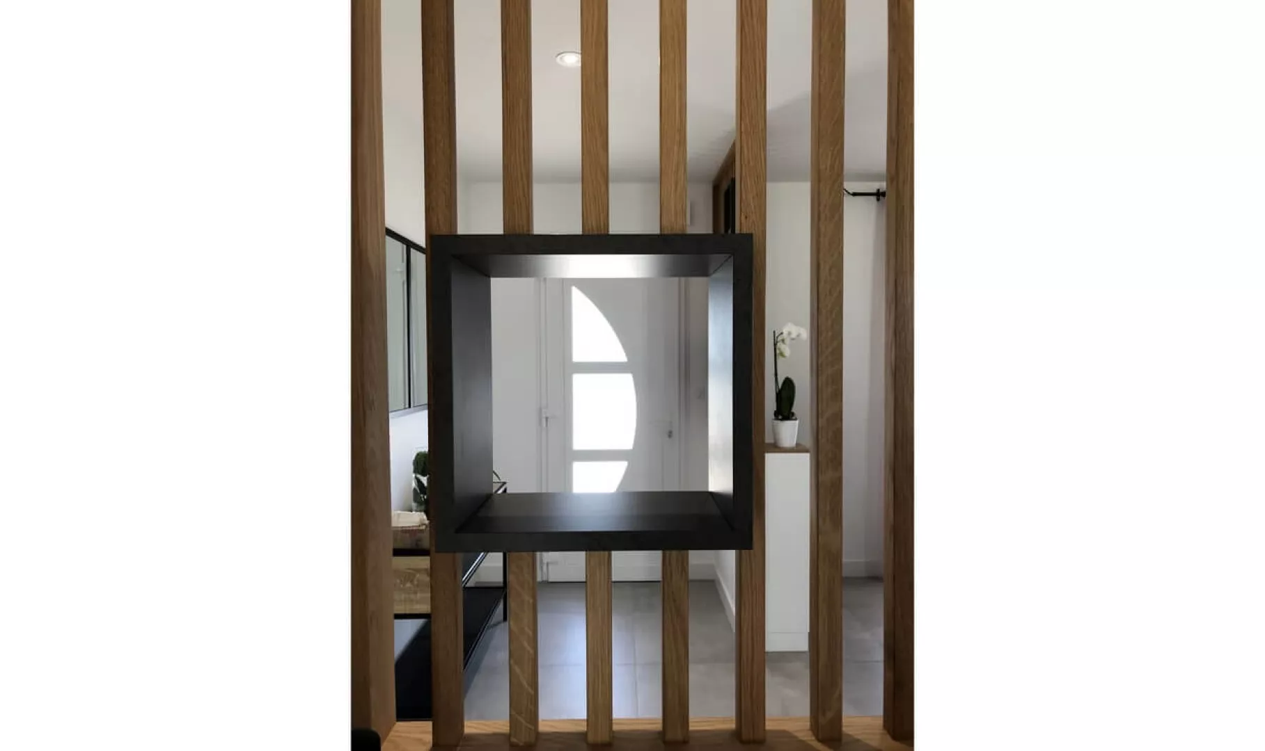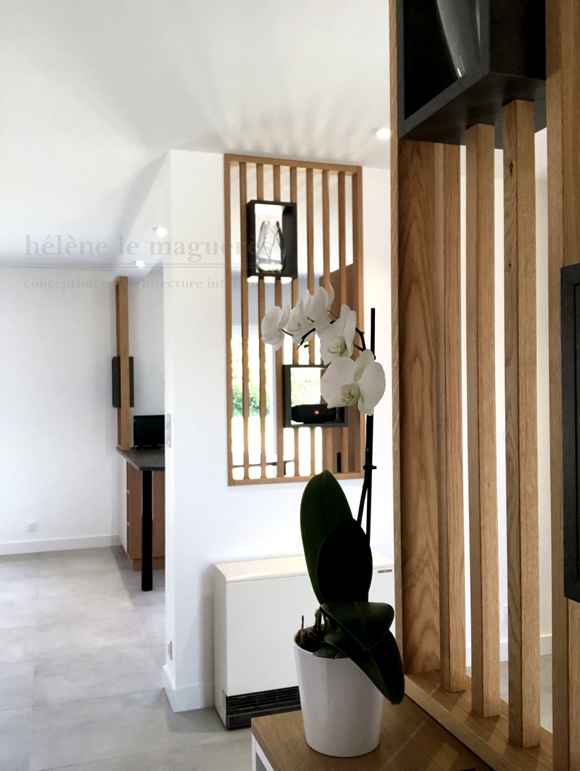 Des claustras en chêne massif huilé amènent des vides et les pleins. Un jeu de transparence se met en place.
