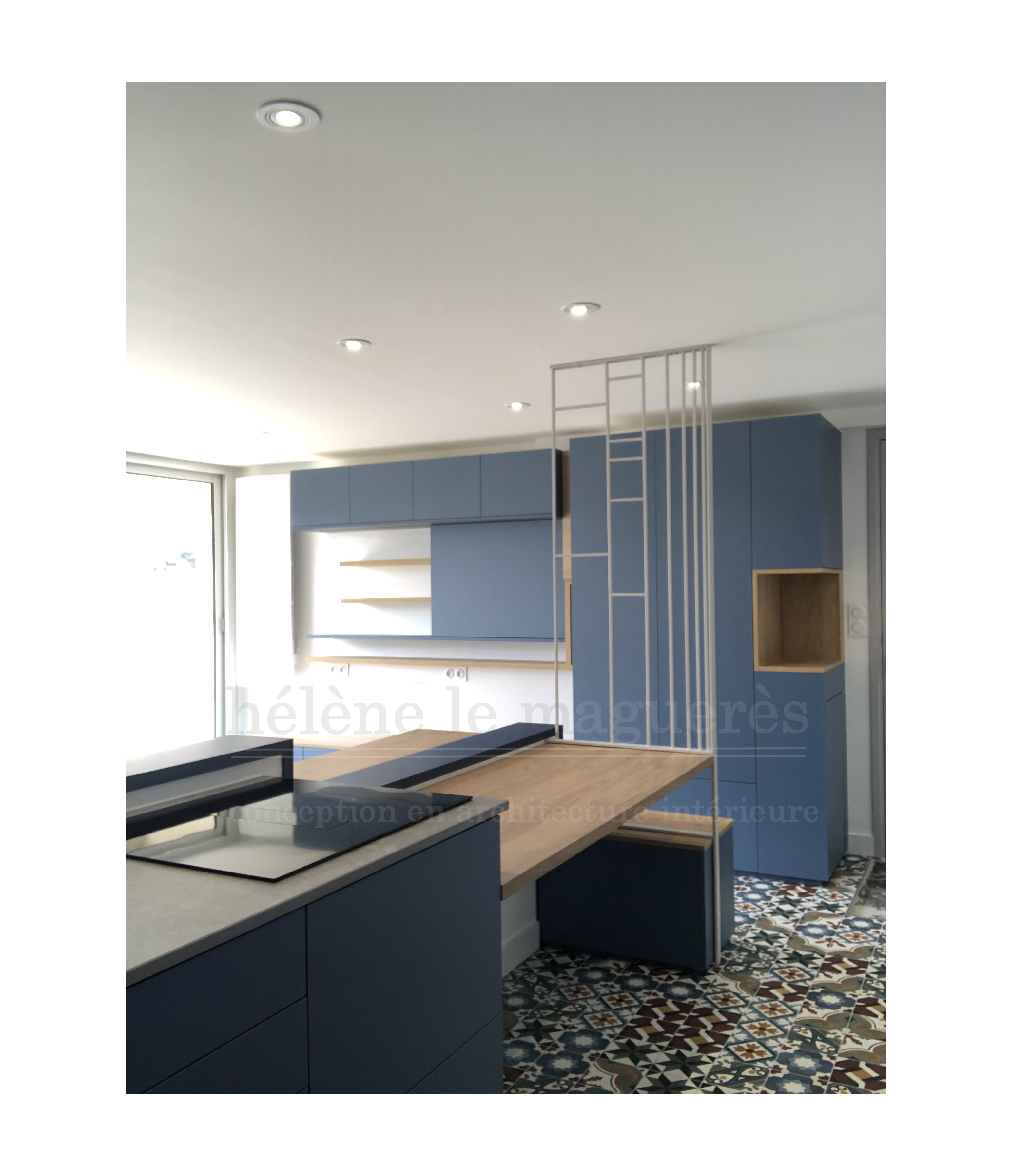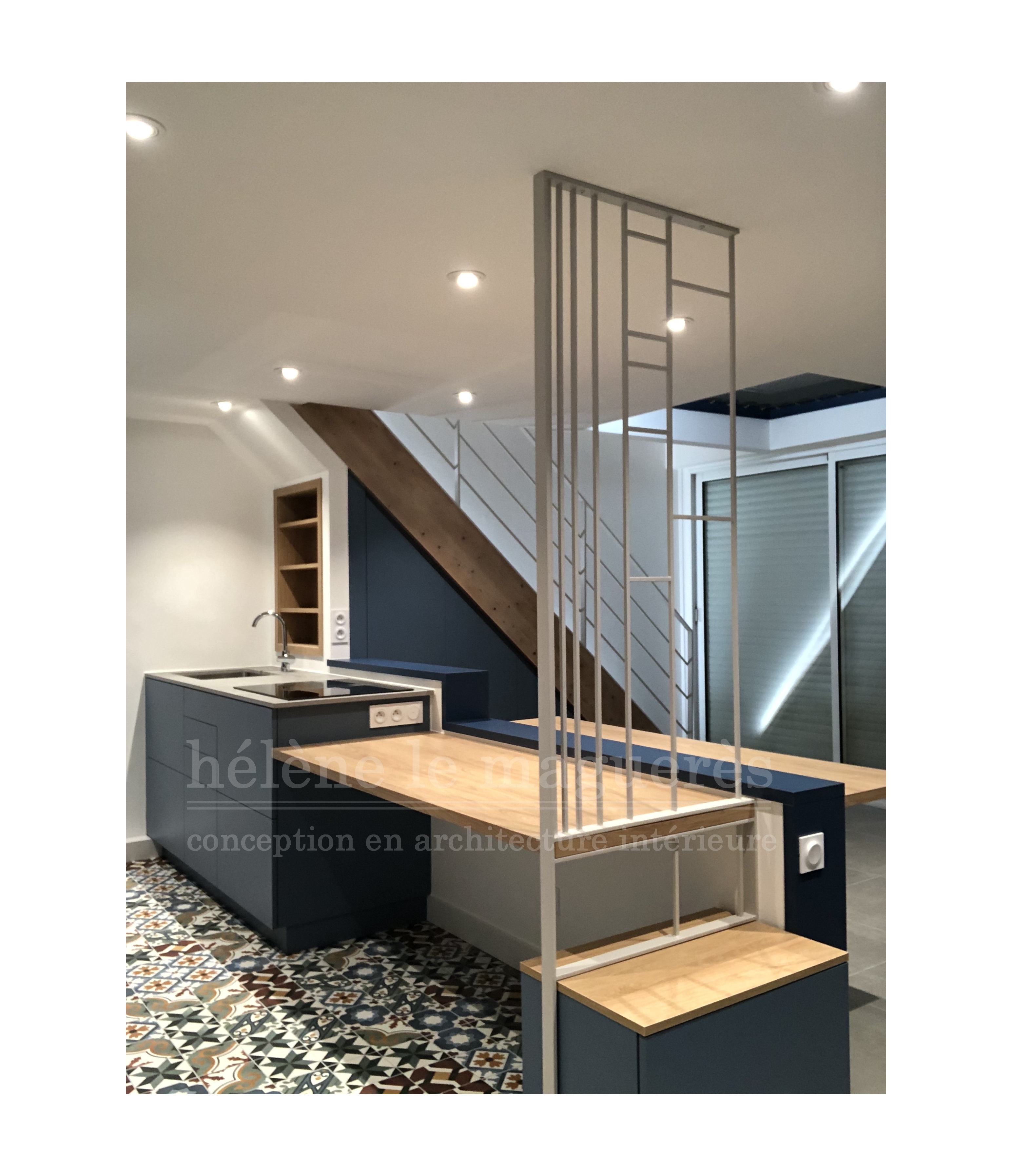 Une assise avec rangement fait face à cette composition. Cette dernière permet également de délimiter la cuisine-repas de l'entrée grâce notamment à son claustra sur mesure en métal.