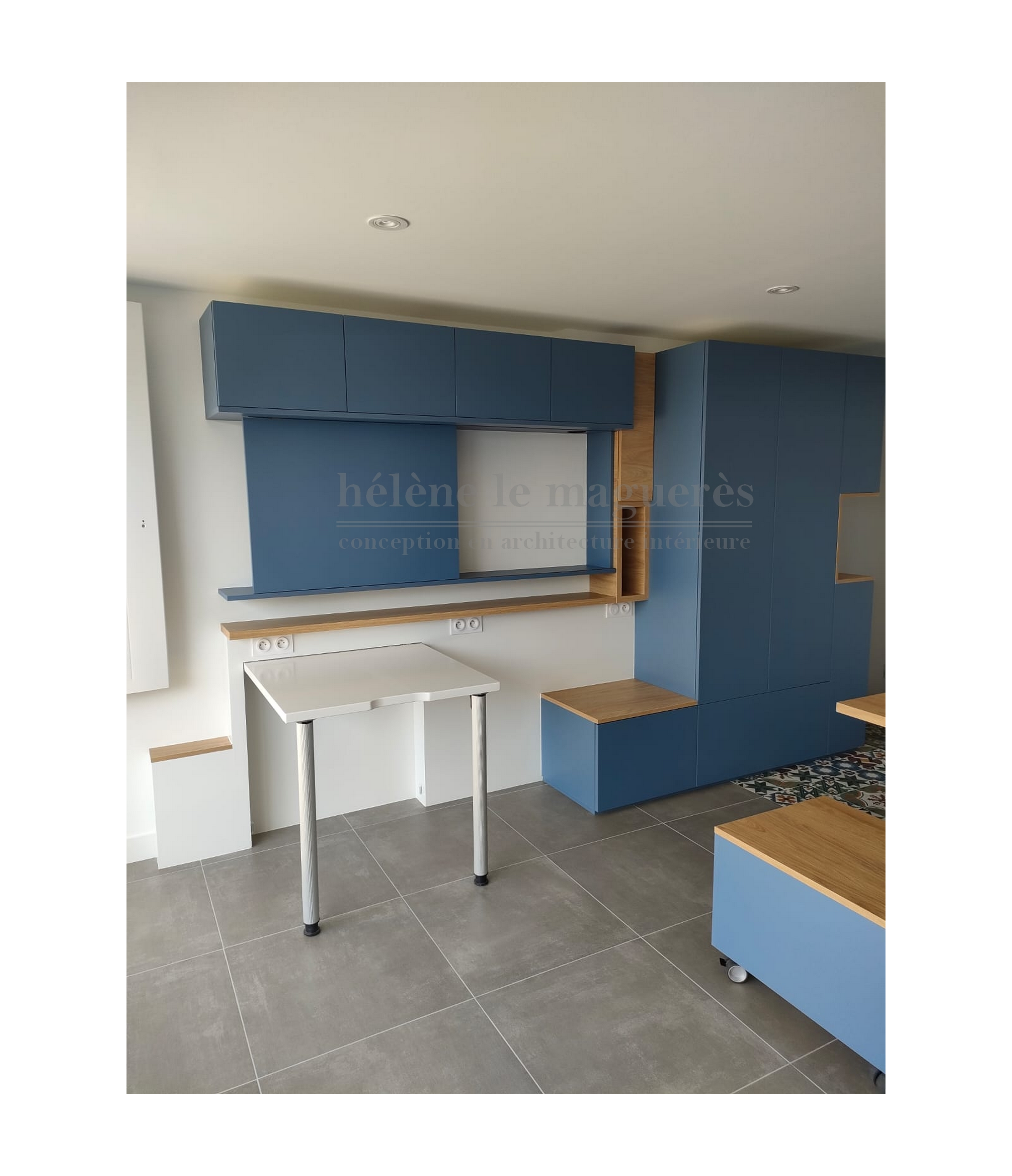 Ce projet intervertit la cuisine et la salle d'eau. Le couloir d'origine ainsi que son placard sont abattus et tout le cloisonnement est repensé afin de créer de nouveaux volumes.