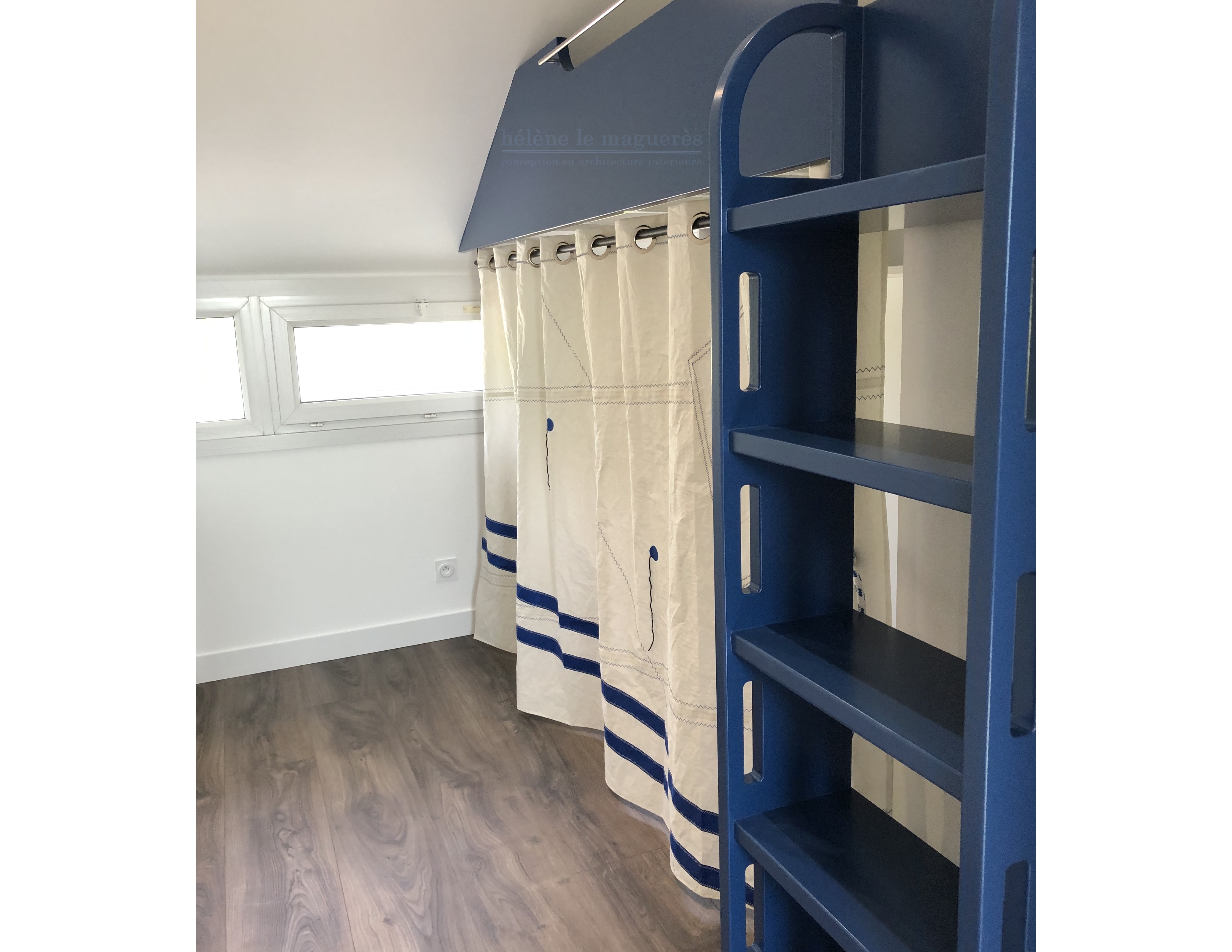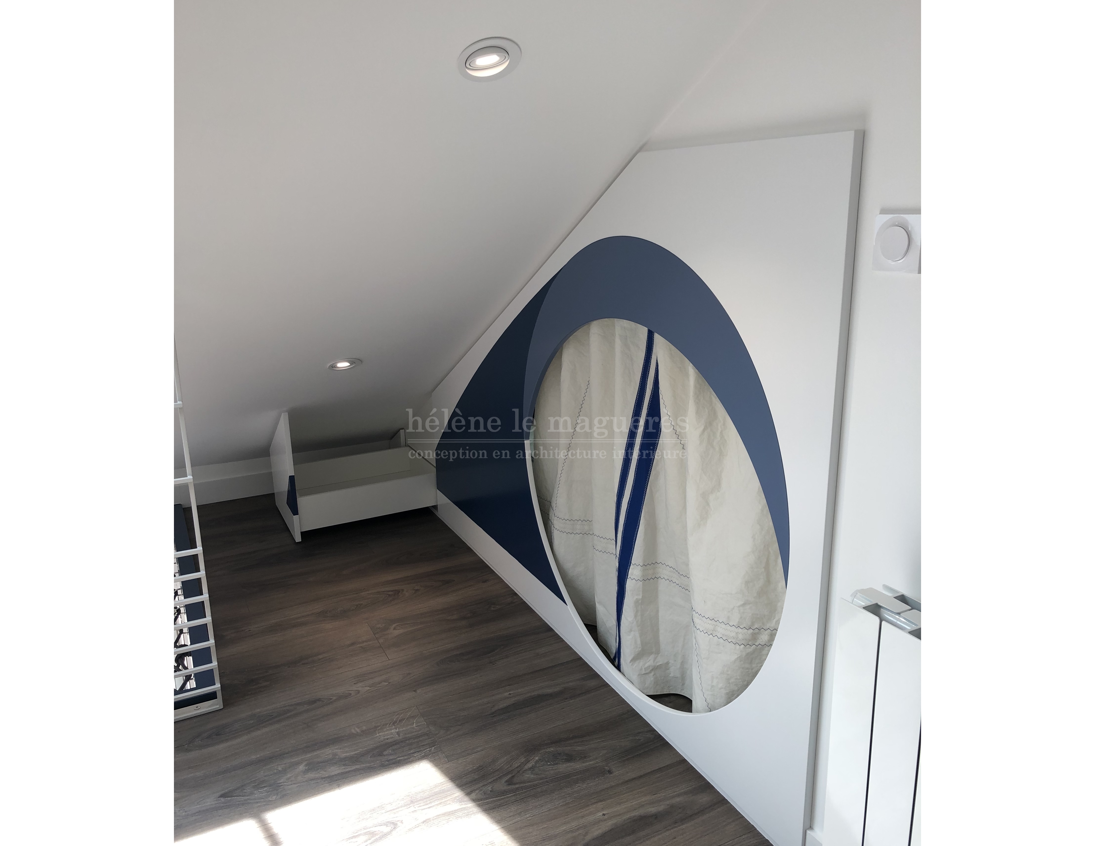 L'accès à la « chambre-cabine » se fait par une ouverture circulaire dotée un rideau en voile de bateau recyclé.