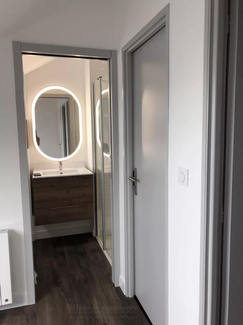 Une porte à galandage permet l'accès à cette salle d'eau, donnant directement sur le meuble-vasques et le w.c. surmonté d'une niche déco et d'un rangement jusque sous le rampant. Cette salle de bain empiète sur la chambre 3 d'origine afin d'y intégrer la douche. La VMC est placée au-dessus de cette dernière, dans un volume isolé phoniquement. Son emplacement stratégique permet l'utilisation du coffrage existant pour distribuer les pièces humides du niveau inférieur.